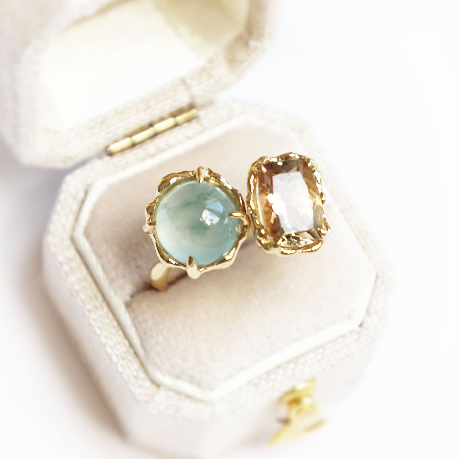 An asymmetrical cluster of Oregon sunstone and translucent jade creates a captivating interplay of warm, glowing hues and cool, serene translucency.