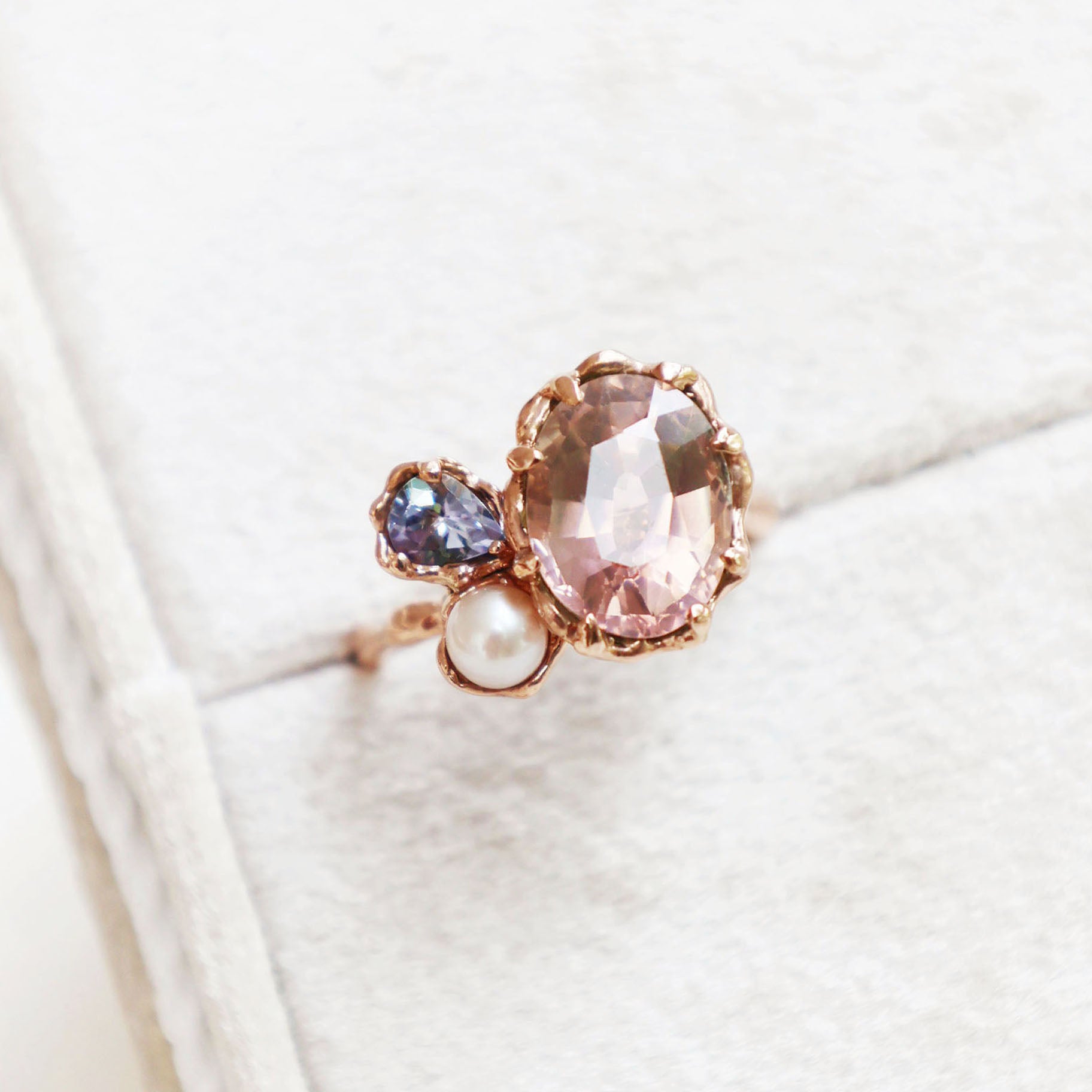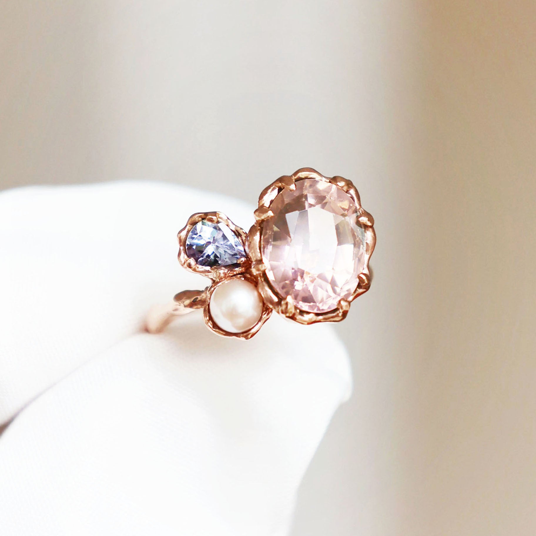 At the heart of Rose Reverie Ring blooms a generous oval-cut tourmaline in a soft pink-peach glow, flanked by a delicate pear-shaped tanzanite shimmering with ethereal purplish-blue depths, and a luminous round pearl in creamy white—each nestled in bespoke bezel settings that celebrate their innate beauty. This asymmetrical arrangement dances with thoughtful balance, a harmonious symphony of colors against the rose gold’s romantic canvas, blending feminine grace with a modern, free-spirited edge.