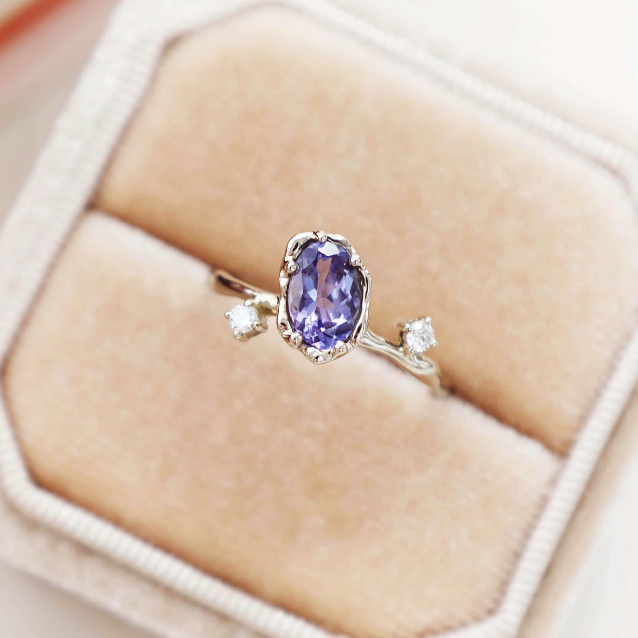 Immerse yourself in the fluid beauty of this 18K gold ring, inspired by the gentle flow of nature’s streams. A luminous oval-cut tanzanite, with its vibrant purple-blue glow, is cradled in an organic bezel that echoes its natural contours. Flanked by two round brilliant-cut diamonds, prong-set asymmetrically, the ring sparkles with subtle whimsy. The band, designed to mimic the graceful ripples of water with a mirror-like finish, flows delicately from the central stone.