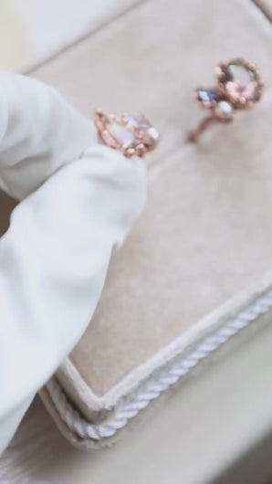 Its companion ring presents an artistic open design where opposites attract—a geometric lavender quartz crystal juxtaposed with a luminous, perfectly round pearl. Each gemstone rests within meticulously crafted rose gold bezels that echo the organic contours of nature itself.